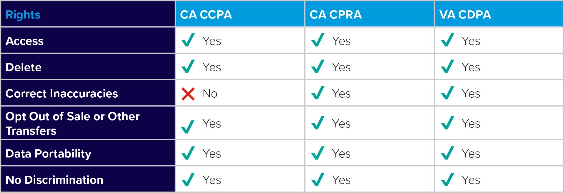 Building on the Individual Participation Principle, the passage of the California Consumer Privacy Act of 2018 (CCPA) made California the first state to provide consumers with individual rights designed to give more control over the personal information that businesses collect about them. Less than two years later, the California Privacy Rights Act of 2020 (CPRA) amended the CCPA by, among other things, modifying the rights afforded to consumers. Most recently, on March 2, 2021, Virginia became the first state to follow in California’s footsteps with the passage of the Consumer Data Protection Act (CDPA). While similar to California in affording consumers certain rights over their personal information, the rights created by Virginia are different in several key respects. The below chart previews how the two states differ with respect to this issue. We then discuss each right in turn.