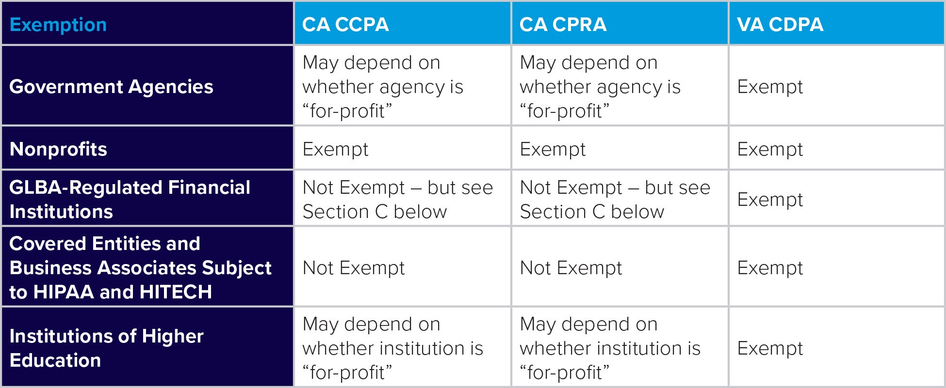 The below chart provides a comparison of the “blanket exemptions” under California’s CCPA and CPRA and Virginia’s CDPA.
