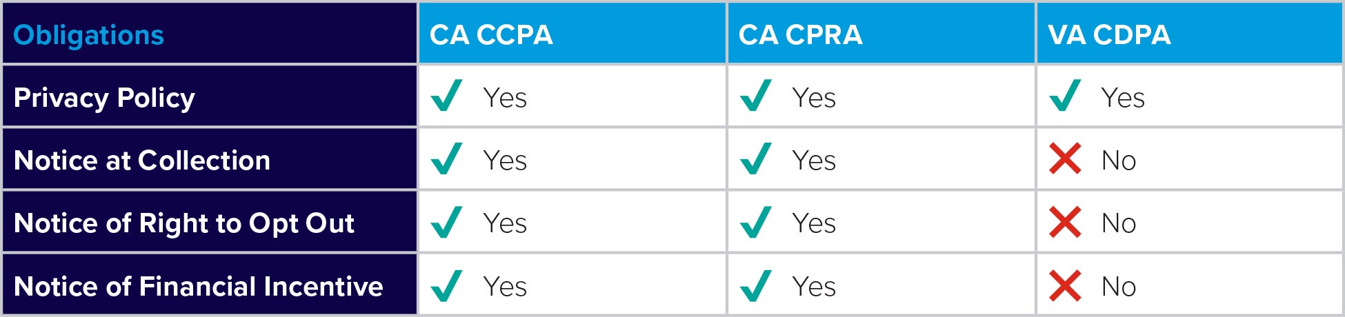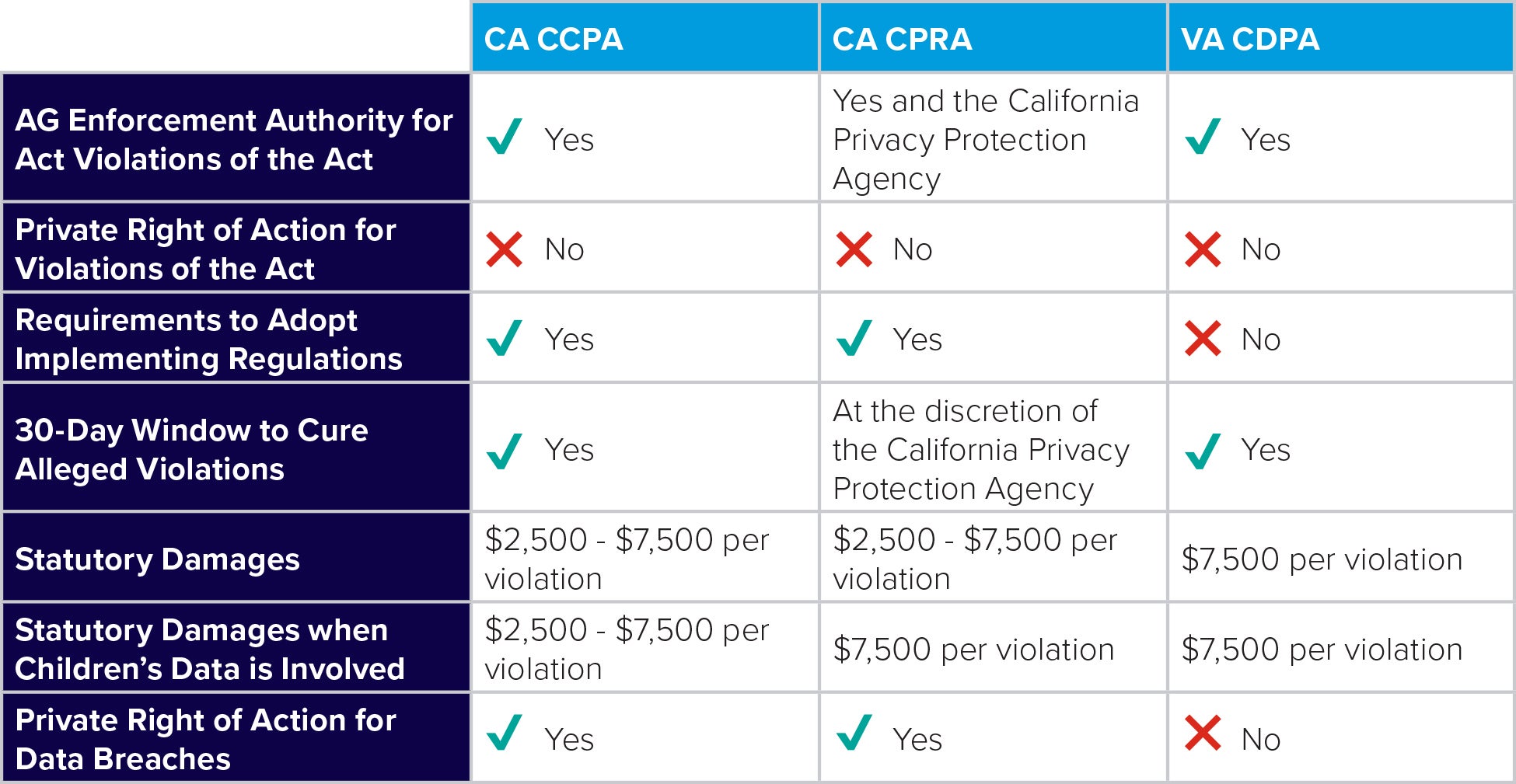 Part five our series will take a deep dive into the enforcement provisions of Virginia’s CDPA, and how such provisions compare to those under California’s CCPA and CPRA. For now, see our preview chart below on how Virginia’s approach compares to California’s.