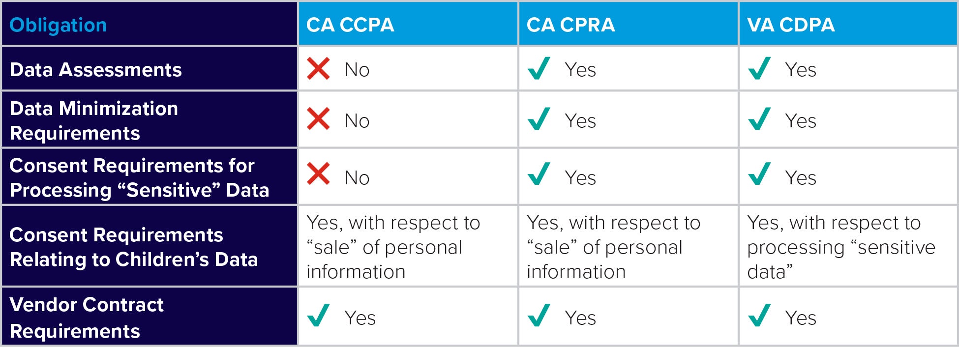 Service providers, and processors, and contractors, oh my! The fourth part of our series will detail the processing obligations imposed by Virginia’s CDPA, and how such obligations compare to those under California’s CCPA and CPRA. The article will focus on issues relating to data assessments and requirements relating to data minimization, obtaining affirmative consent to process certain types of information, and vendor contracts.[5] The below chart provides a high-level overview how the two states differ with respect to these issues.